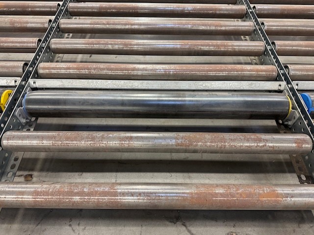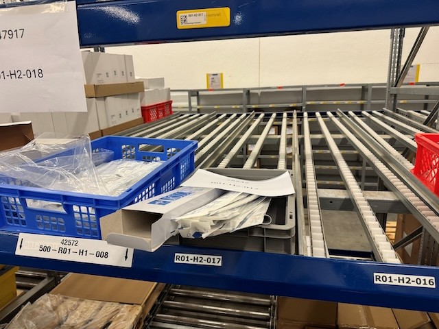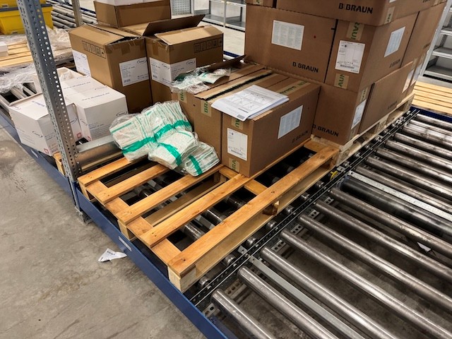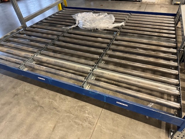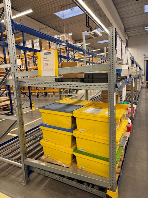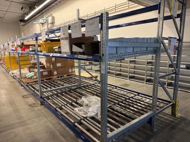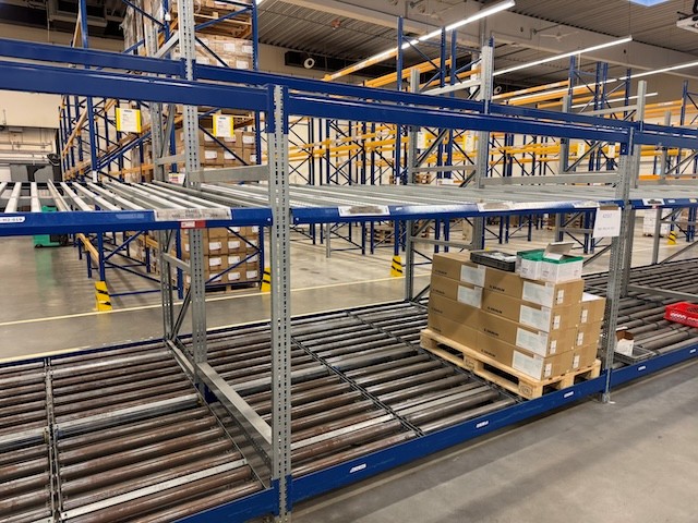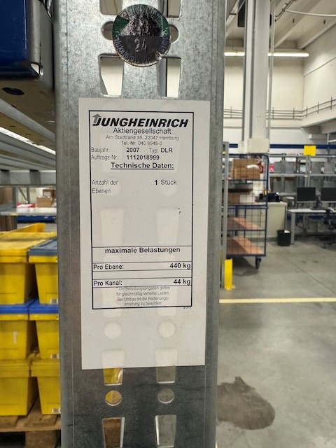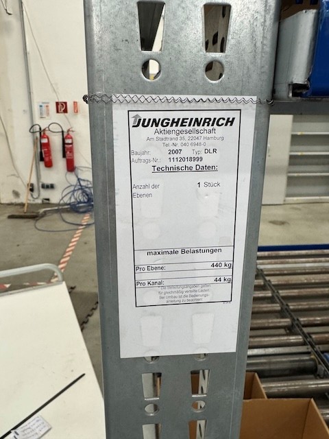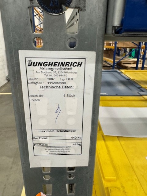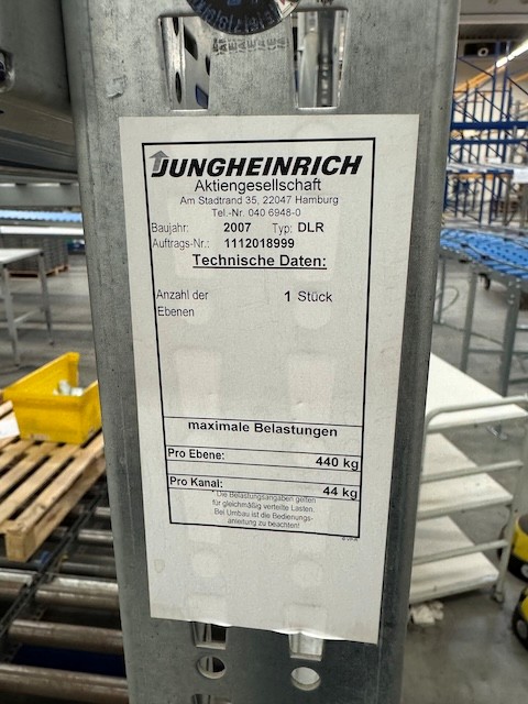 2x 7 Felder Palettendurchlaufregale mit 1 Durchlaufebene für Kisten / Kartons und einer Ablageebene für Paletten, Jungheinrich – gebraucht – :