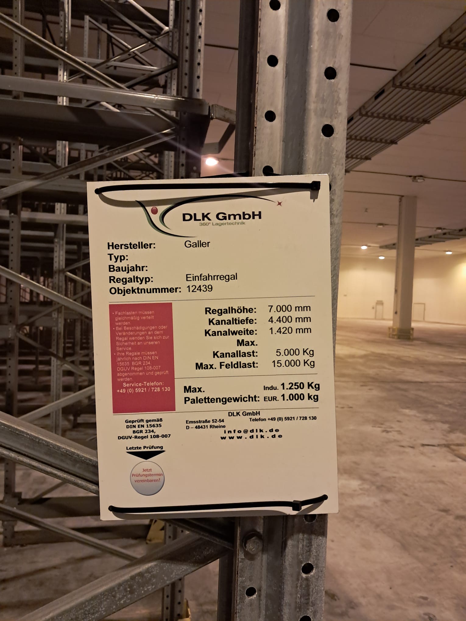 Einfahrregal, Galler, ca. 675 Palettenstellplätze, 1.000kg / Palette – gebraucht -: