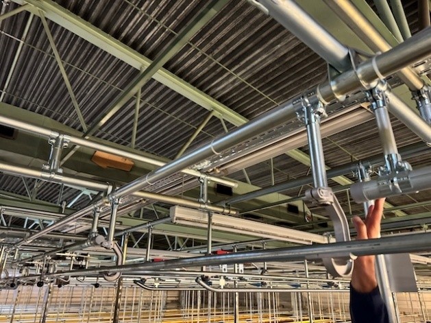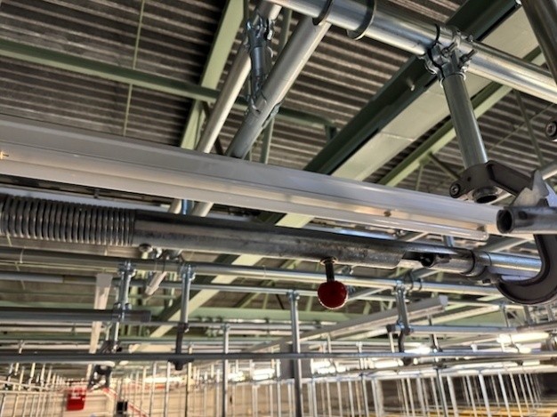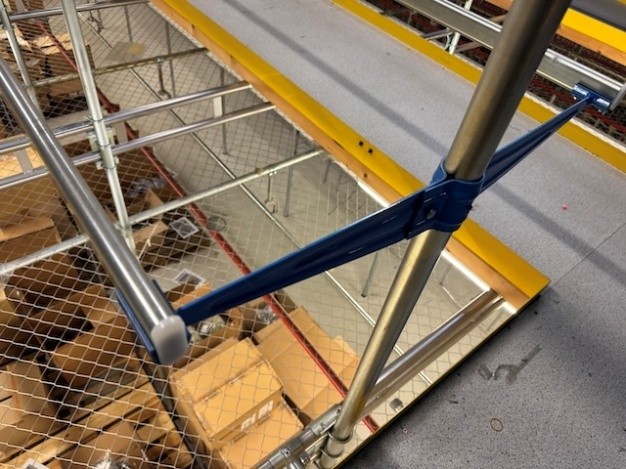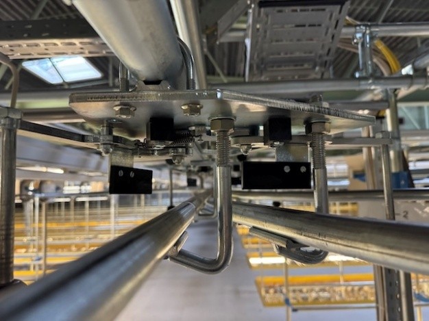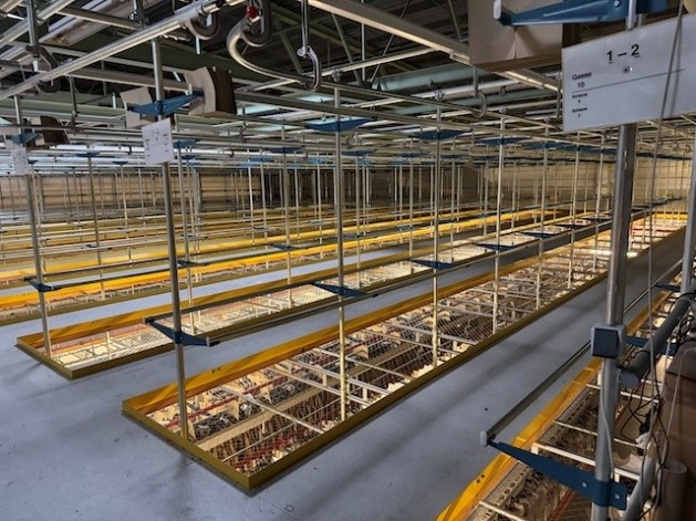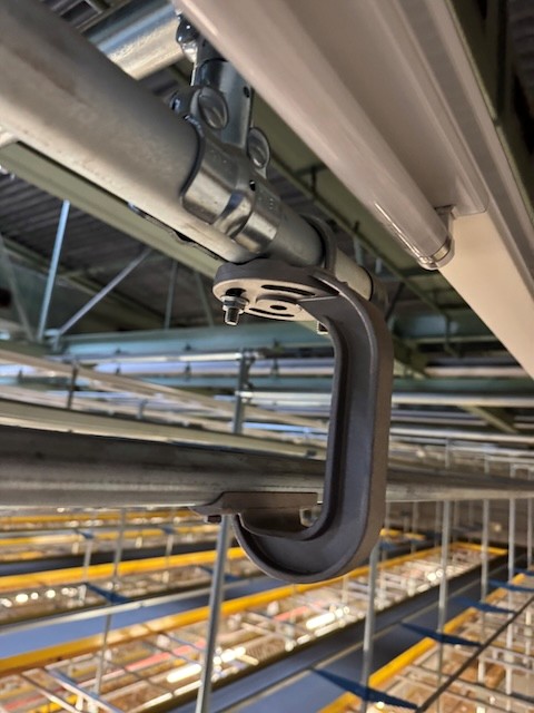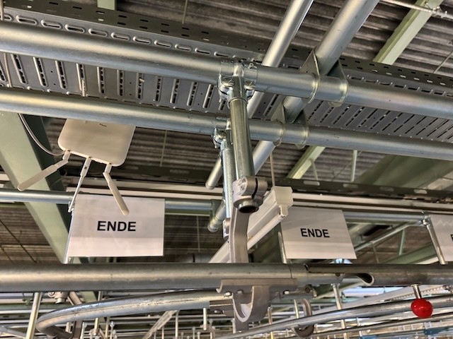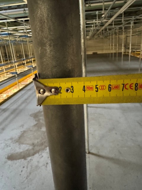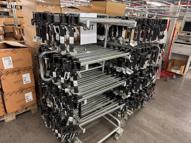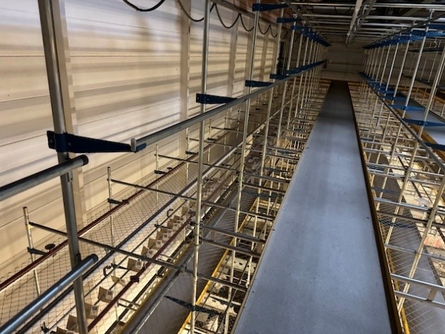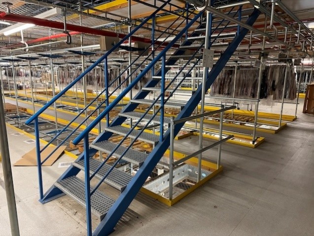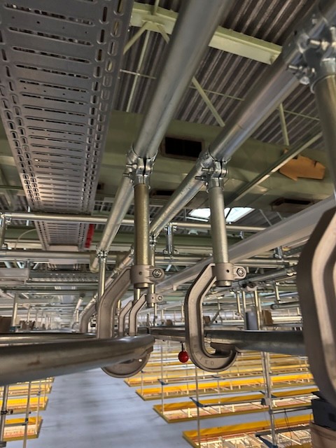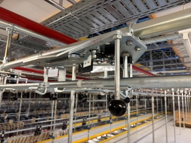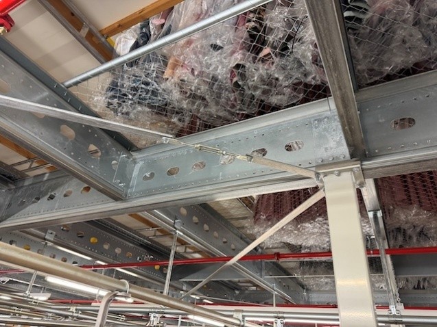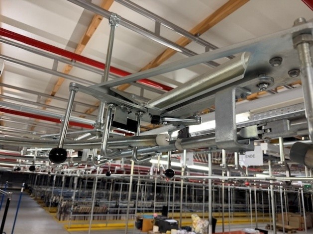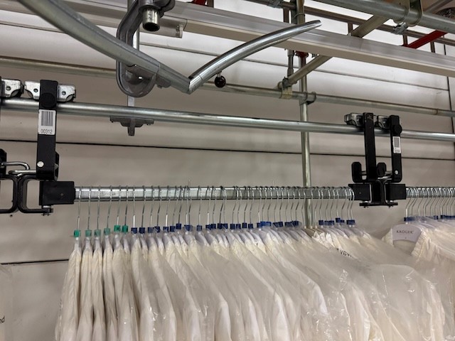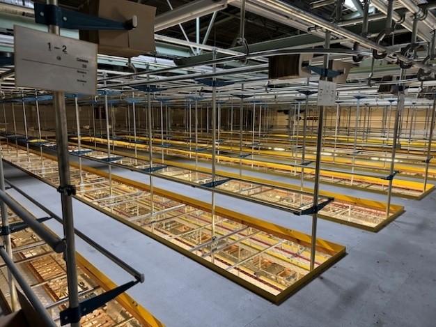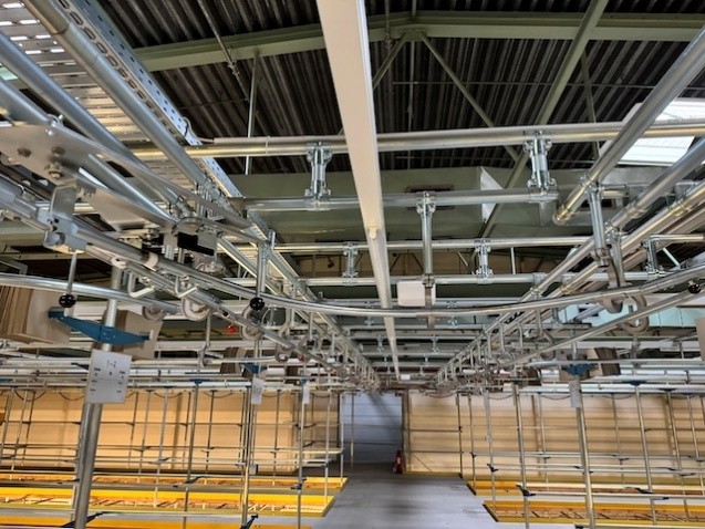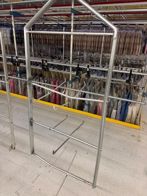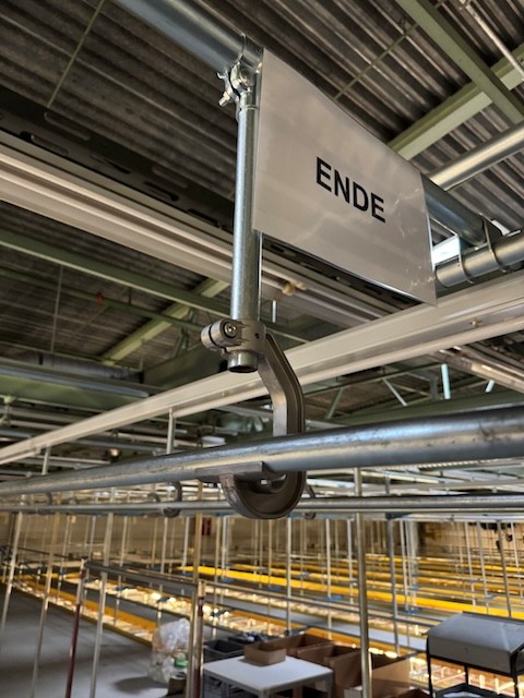 Statisches Hängetextillager, Rundrohrhängebahn, Meiko, ca. 5.000m statische Lagerschienen, ca. 3.600m Trolleysschienen, ca. 1.200 Trolleys, 3 Etagen, inkl. 2.852 m2 Lagerbühne in der Grundfläche, Gesamtfläche ca. 8.556m2 – gebraucht – :